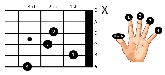 - Standard Open Position: Place your index finger on the 1st fret of the B string (2nd string). Place your middle finger on the 2nd fret of the D string (4th string). The G string (3rd string) and high E string (1st string) remain open, while you avoid strumming the low E string.