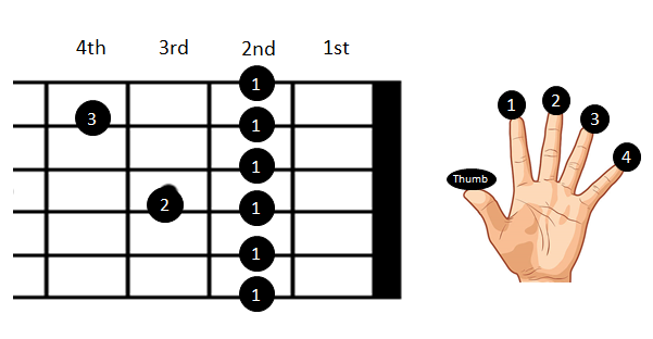 1. Index Finger: Barre all six strings at the 2nd fret.